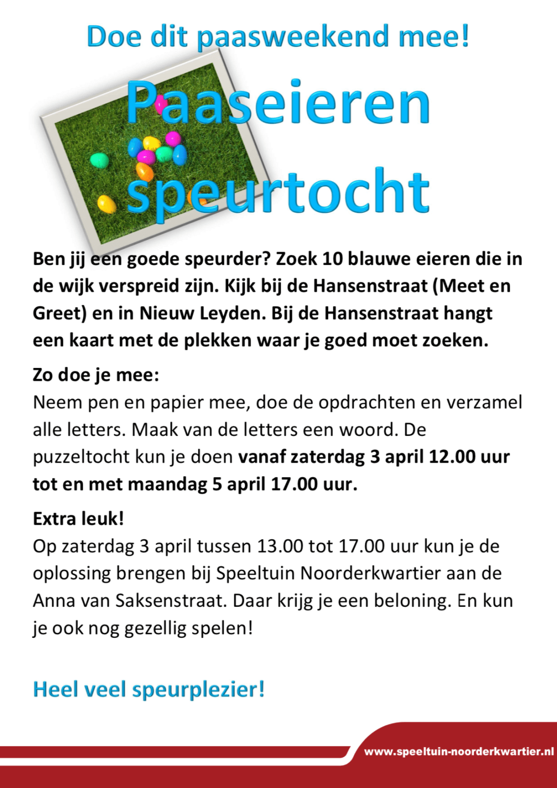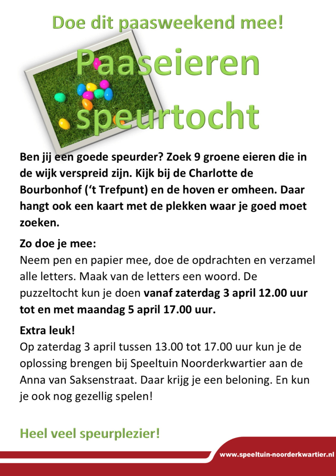 Op zaterdag 3 april tussen 13.00 tot 17.00 uur kun je de oplossing brengen bij Speeltuin Noorderkwartier aan de Anna van Saksenstraat. Daar krijg je een beloning. En kun je ook nog gezellig spelen!
