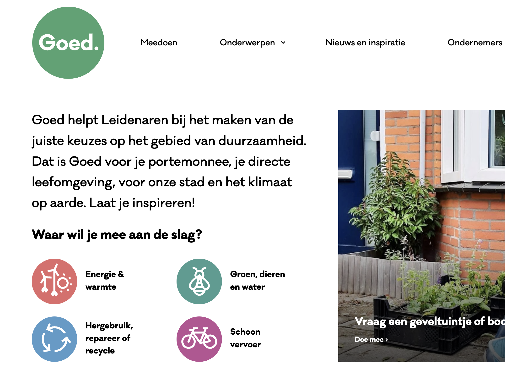 Er is onder andere een activerende Meedoen rubriek en een rubriek met Nieuws & inspiratie. Ook is er een Goed. Netwerk in de website gebouwd. Hier kunnen alle partijen, organisaties, duurzame initiatieven en clubs die iets doen op het gebied van duurzaamheid een eigen plekje krijgen.